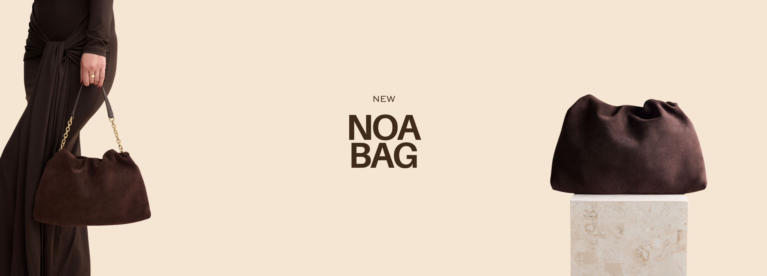 The NOA bag is crafted in rich chocolate brown suede, a sophisticated piece that transitions effortlessly from day to evening wear. The shoulder strap tucks discreetly inside for clutch-style carrying, while distinctive rouched detailing frames the opening with textural interest. A secure magnetic closure keeps your essentials protected. Perfect for those who appreciate refined minimalism and practical luxury.